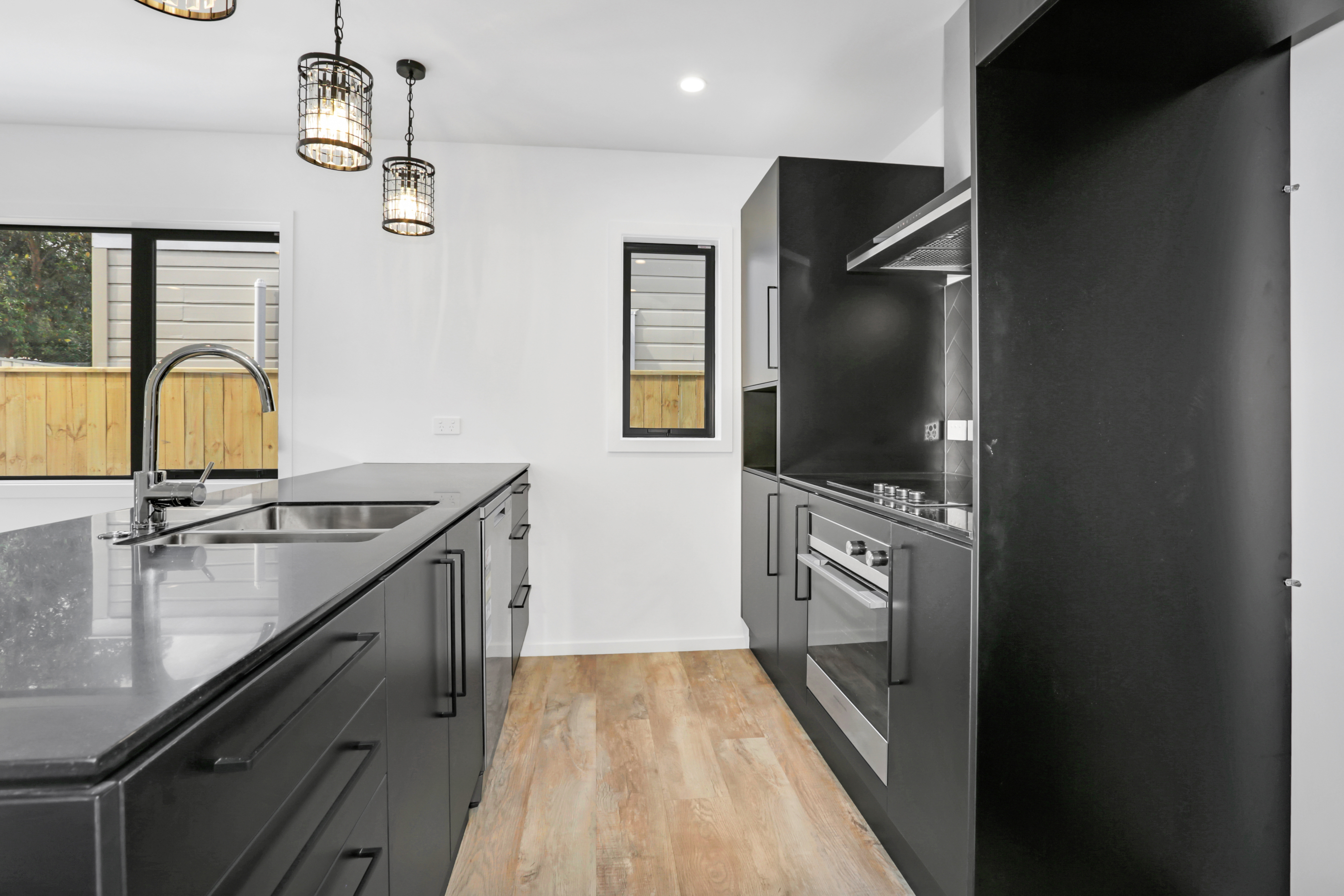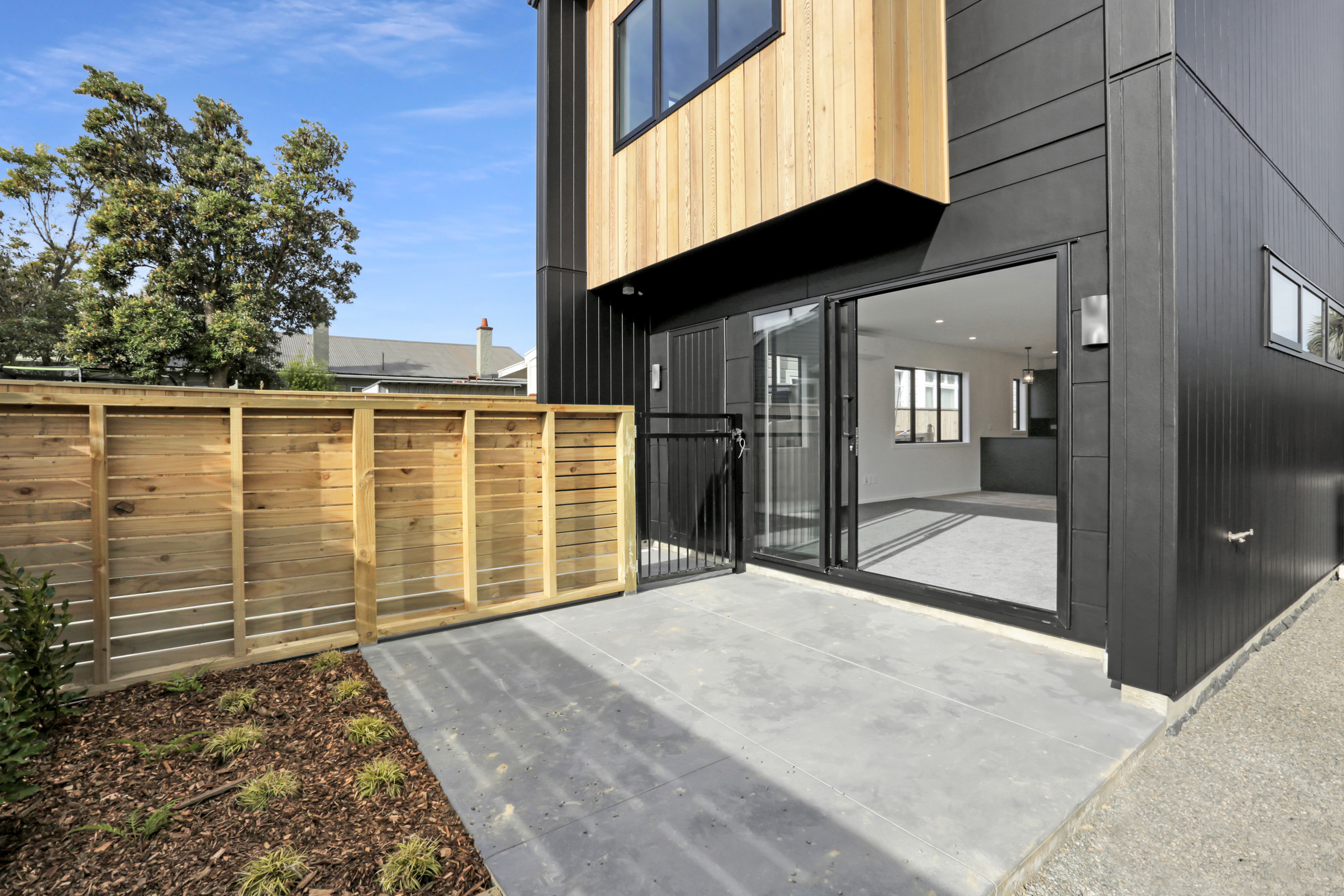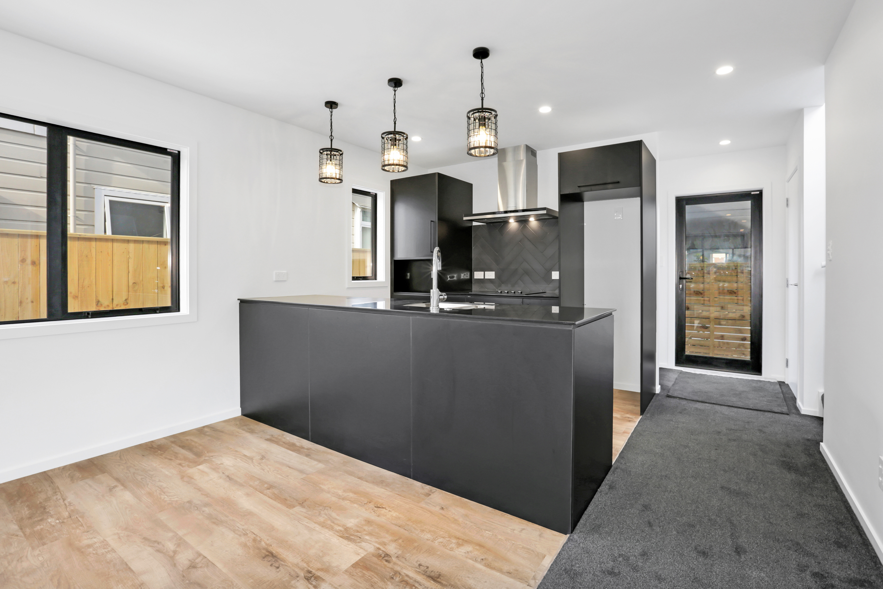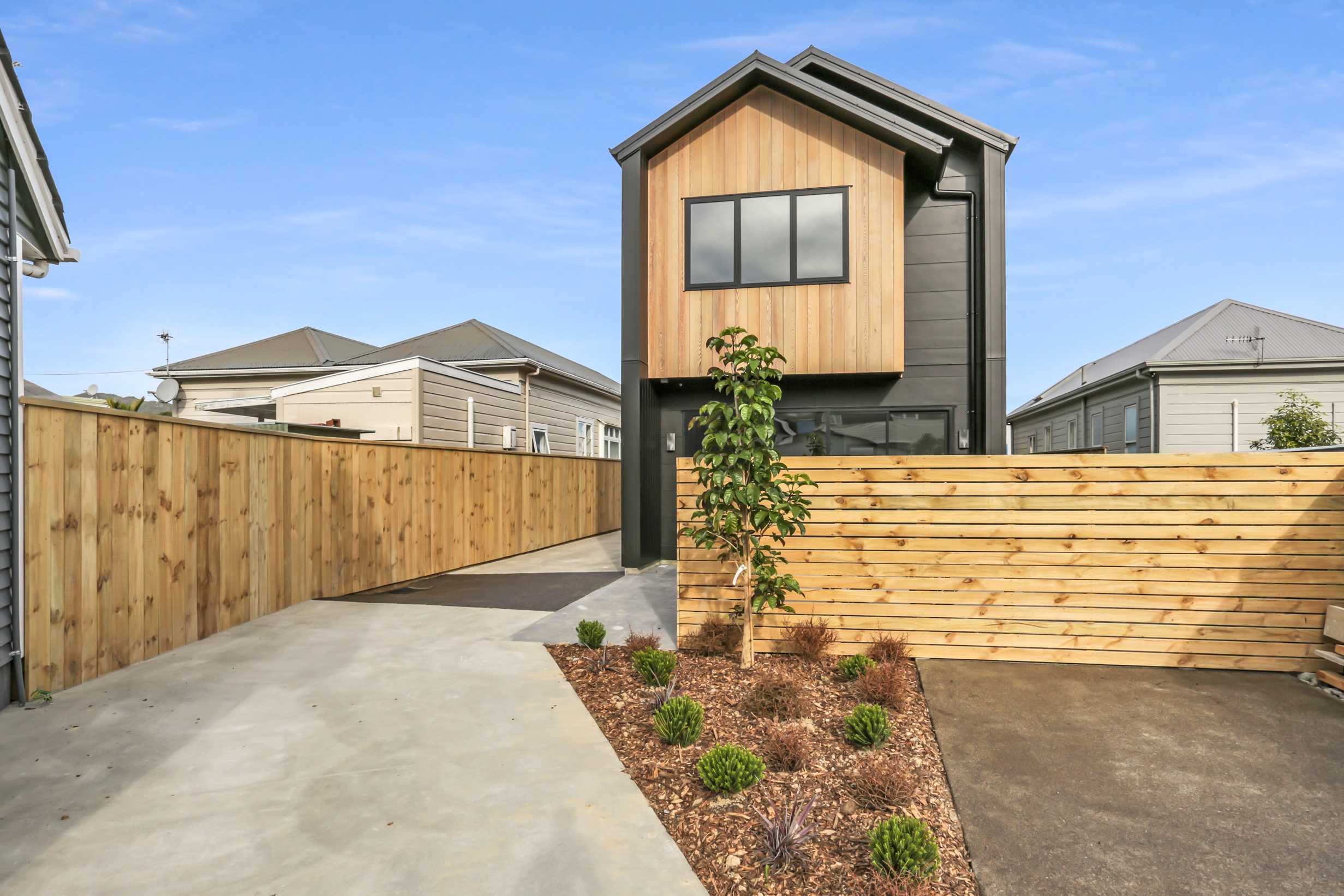 Centered in the heart of Lower Hutt, the new build is well positioned within walking distance of all major amenities. Step into the ground floor and enjoy open-plan living and all-day sun. The kitchen, which is dressed in black, is connected to the living area – a proud place from which to entertain indoors, if the outdoor living area is affected by the weather. The two-storey design makes efficient use of space – you’ll find the laundry discreetly tucked away under the stairs and stacked sliders lead to the main outdoor area. Design ingenuity in this compact home carries on upstairs, where you’ll find two large bedrooms, plus a study that could accommodate an overnight guest. A well-appointed bathroom serves this area, while a guest bathroom serves the downstairs. A sharp contemporary look is achieved on the exterior, thanks to the contrasting use of cedar on black Stria.