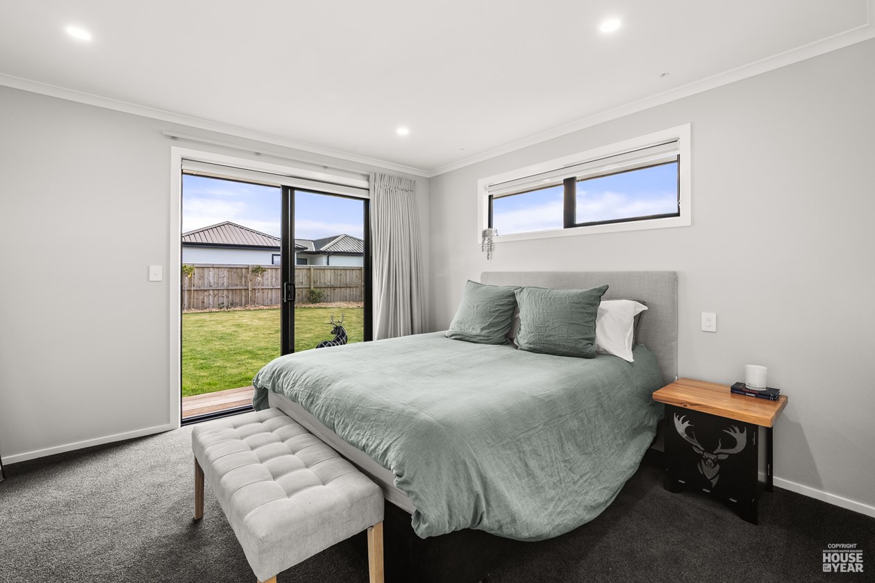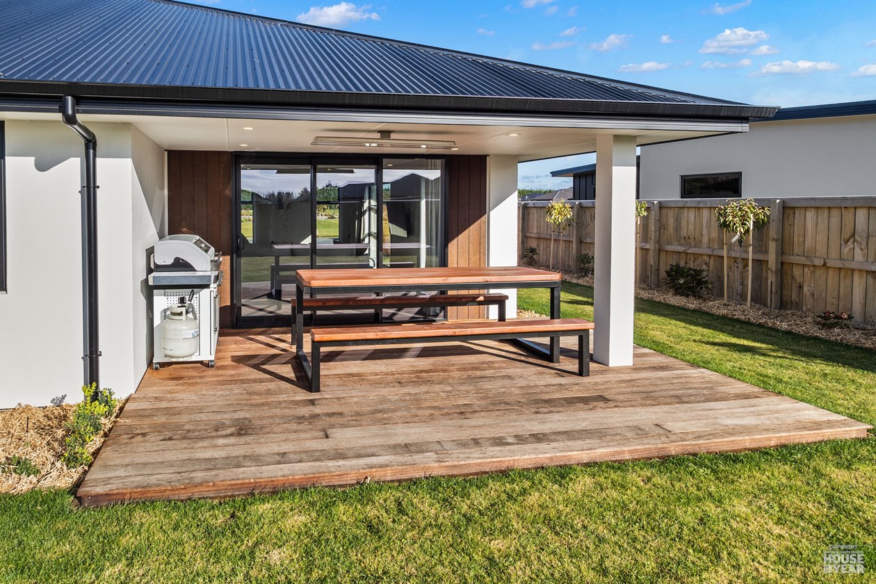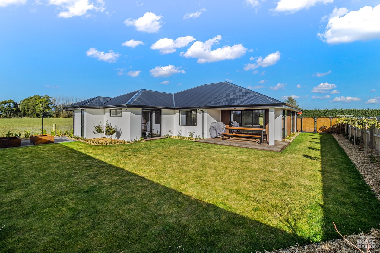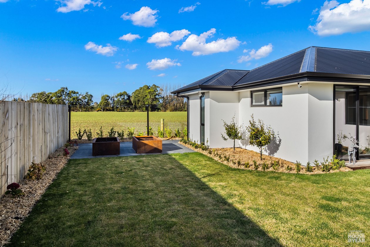 You’d be hard pressed to find a home better suited to laidback living on the shades-of-green plains below the Southern Alps. The landscape is stunning, but so is the 254sqm pavilion style home that inhabits it. A trio of gables clad with vertical weatherboard, brick and coloured steel is your welcoming committee. Head inside and the three-bedroom house lives up to its exterior promise. The modern kitchen has a walk-in pantry, and the lounge, off to the side, also has a pitched ceiling that extends into an alfresco area with a barbecue, lights and heaters. In the second pavilion are the three bedrooms, the main one with an ensuite with large marble-look tiles, a walk-in wardrobe, and direct access through sliding doors to the deck and hot tub. Another bathroom and double garage complete the wing.