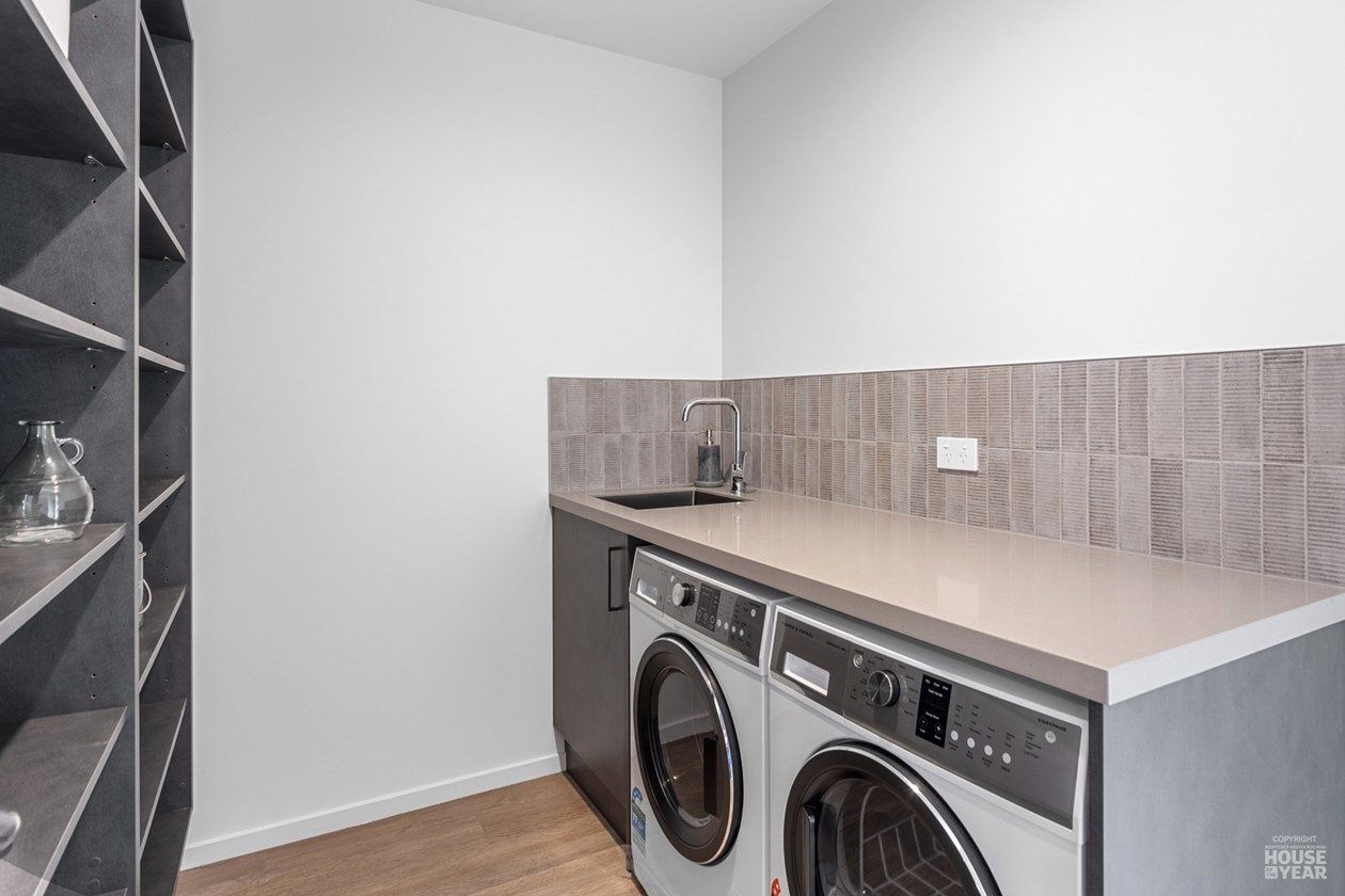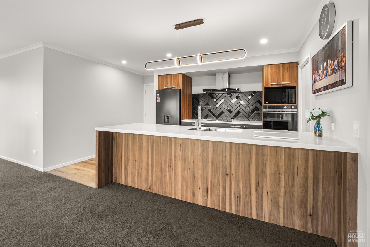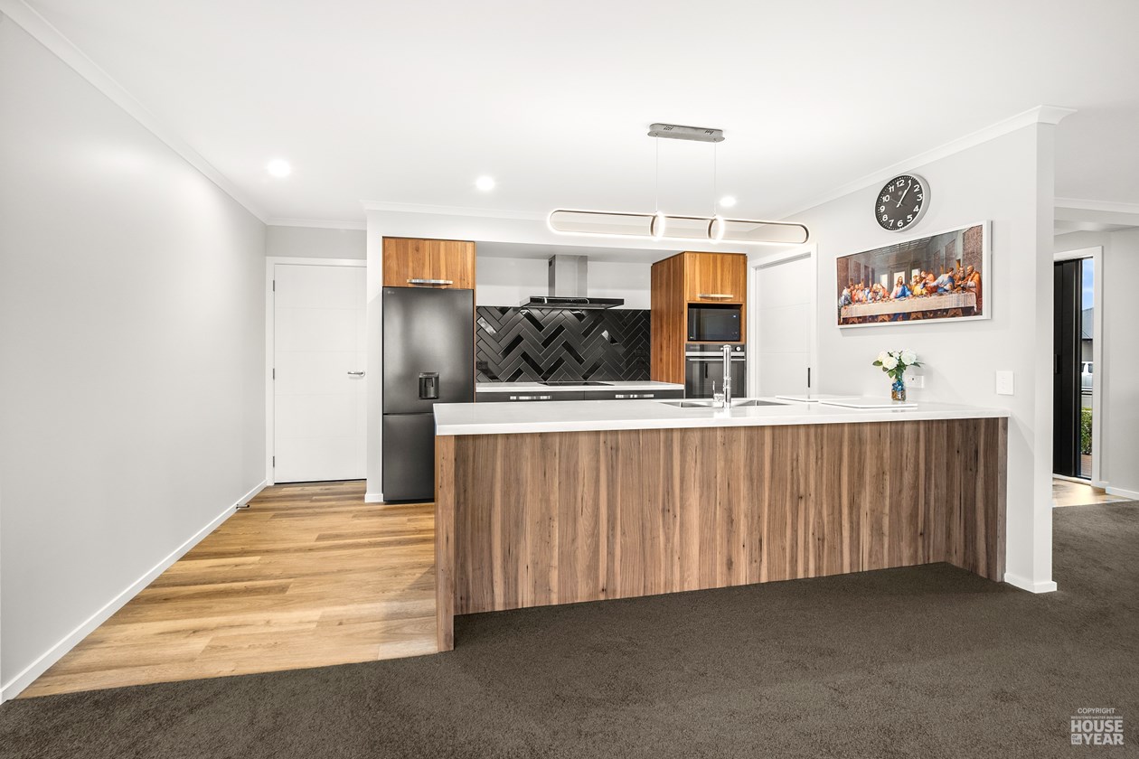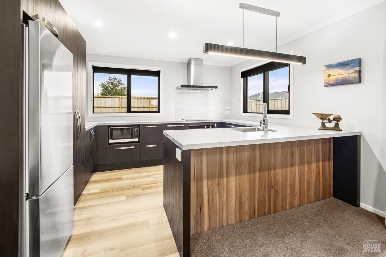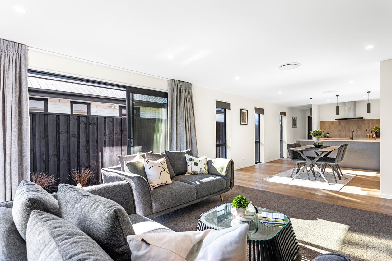 This lovely, modern 261sqm home features an open-plan living-kitchen-dining area, plus a second lounge, three bedrooms and two bathrooms. The well-planned gourmet kitchen with gas hob allows for easy everyday meals. Large windows and stacker sliders face north, capturing all-day sun and leading to outdoor living. The large master bedroom features its own ensuite and walk-in wardrobe. On the outside, landscaping compliments the Rockcote Integra cladding with stylish simplicity.