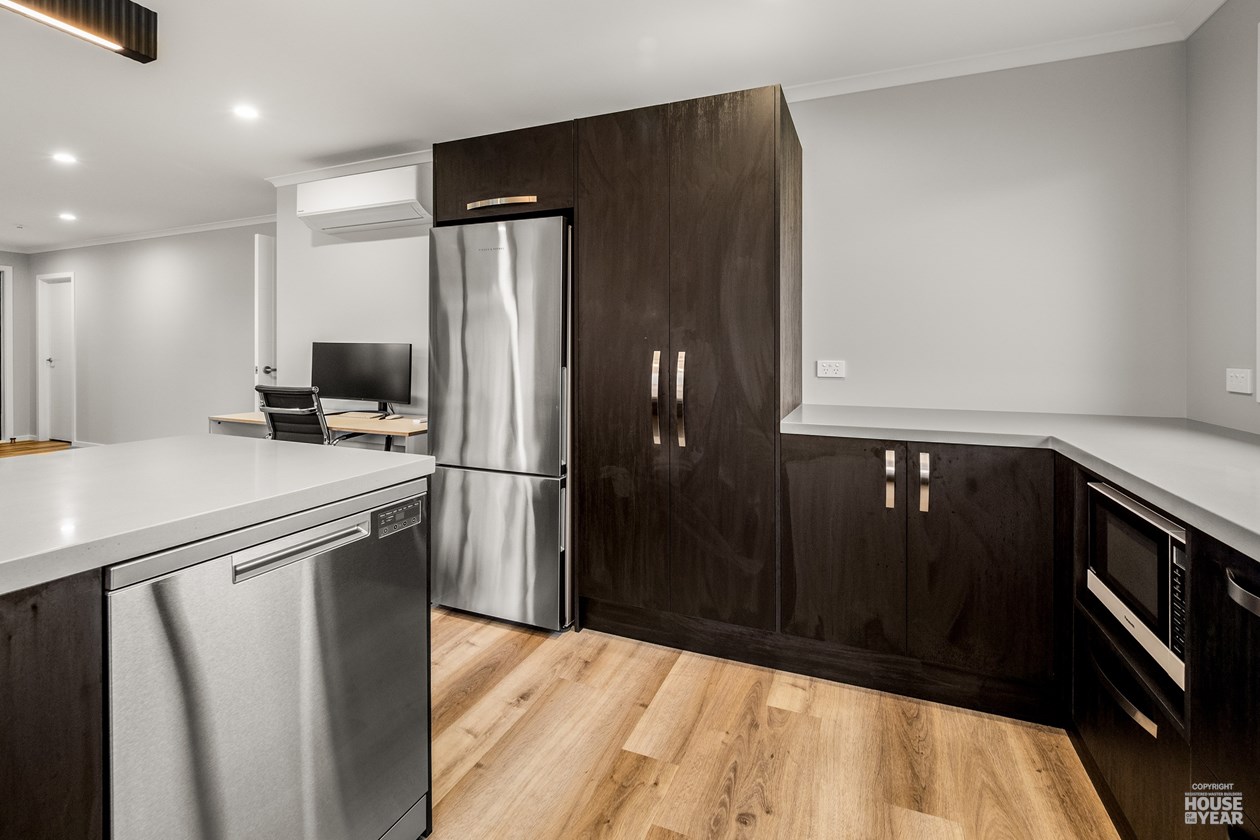A combination of light and dark on the exterior increases the overall sense of size of this 124sqm dwelling in Parklands, Christchurch. With a north-facing rear living space, this house is private and sunny. A coloured concrete patio off the living area adds indoor-outdoor flow for fine days. The good-sized kitchen provides a pleasant space to prepare meals while chatting to family at the breakfast bar. Brushed Pewter Melamine joinery works well with the Tristone bench in Frostland. The black toekicks and glass splashback continue the home’s classic palette, tying inside and out together. A good-sized laundry area in the garage comes complete with storage cupboard for keeping necessary items in reach but out of sight. Three bedrooms, a bathroom with shower and tub, and an ensuite and walk-in robe in the master bedroom, complete this well-presented home.